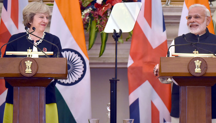 The Prime Minister, Shri Narendra Modi with the Prime Minister of United Kingdom, Ms. Theresa May, at the Joint Press Briefing, at Hyderabad House, in New Delhi on November 07, 2016.